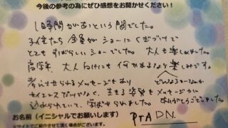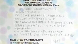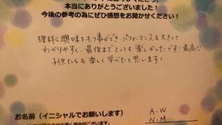 今日はたのしいサイエンスマジックシヨーを、ありがとうございました!!マジックでは引き込まれるような表情の子どもたち、たのしみながら科学も学べてすばらしい様子をみながら時間も調整してくださり.ありがとうごうございます。空気砲を"もっともっと"...