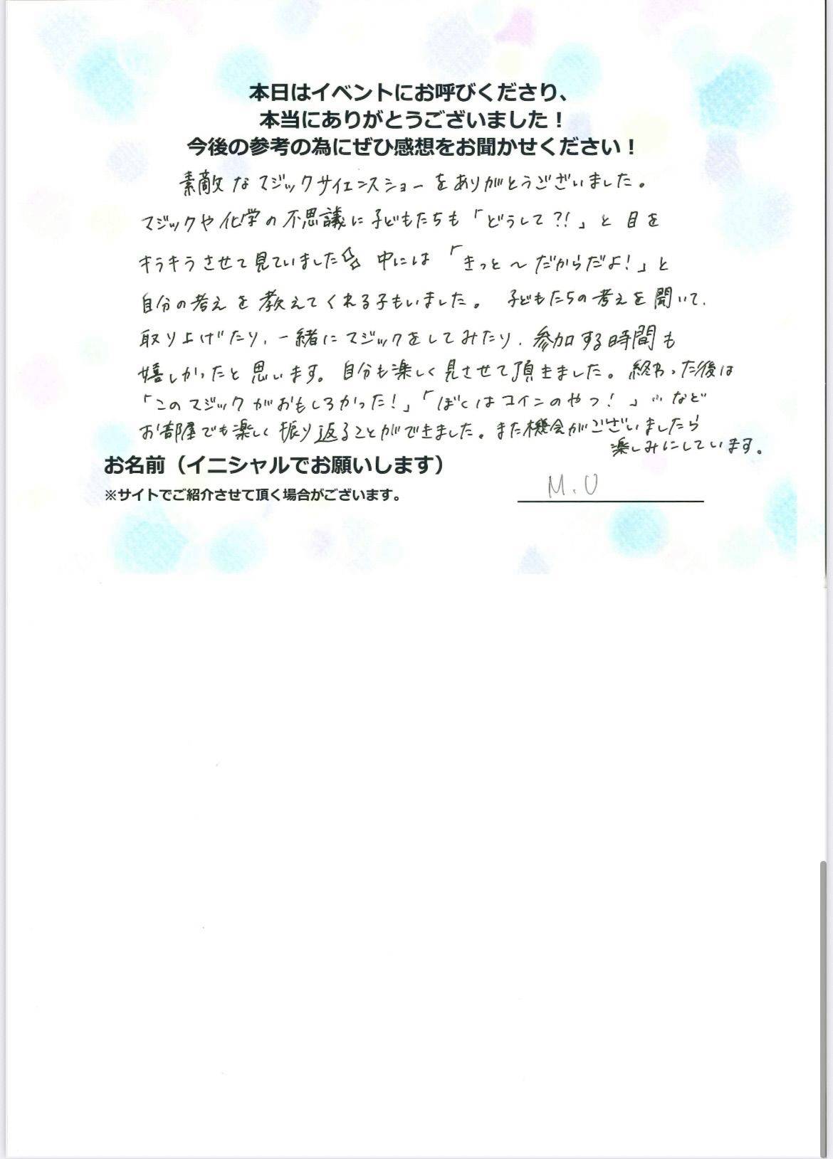嬉しかったと思います。自分も楽しく見させて頂きました。終わった後は「このマジックがおもしろかった!」「ぼくはコインのやつ!」《など