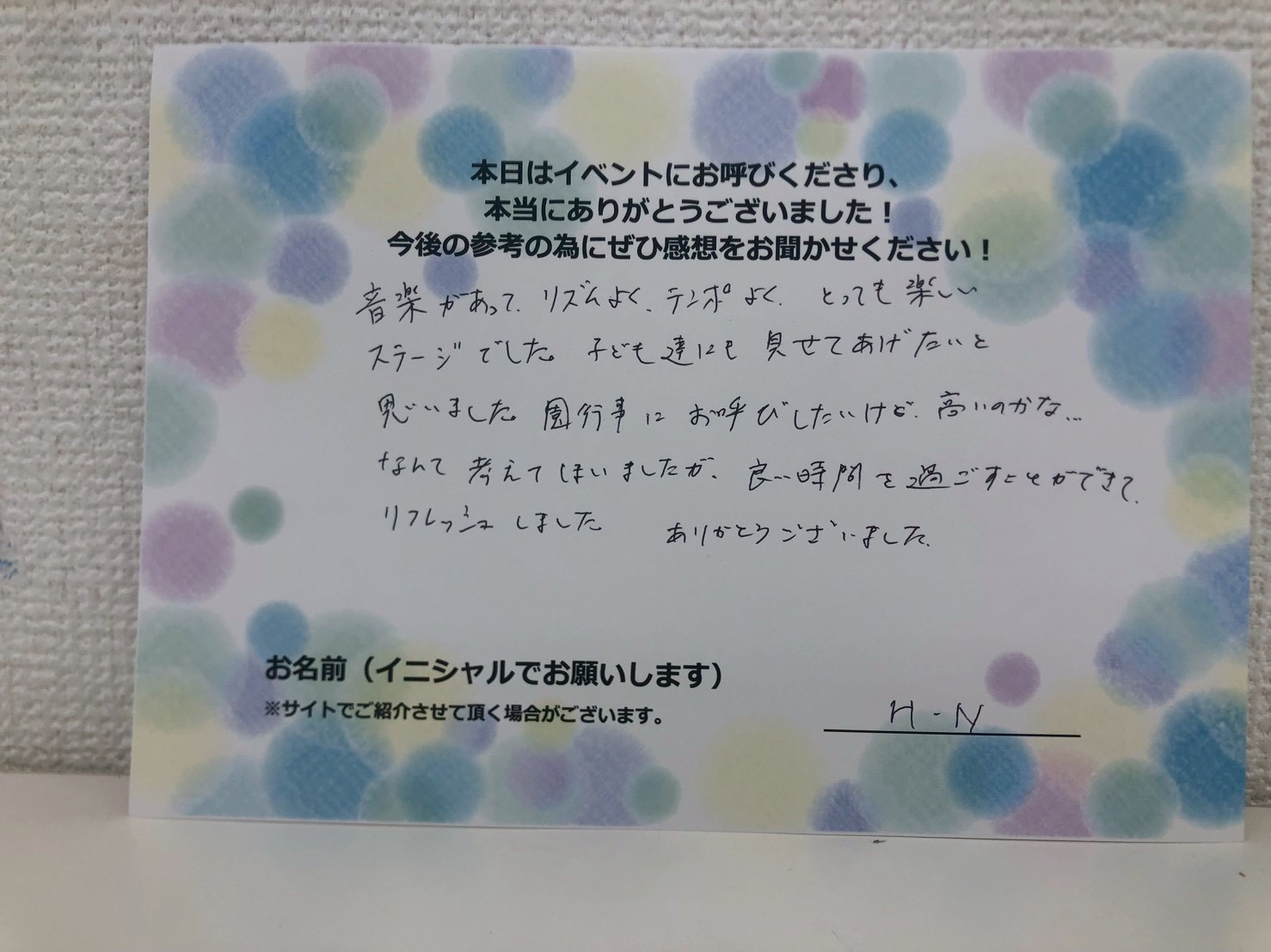 音楽があって、リズムよくテンポよくとっても楽しいステージでした。子供たちにも見せてあげたいと思いました。良い時間を過ごすことができて、とてもリフレッシュできました。ありがとうございました。 H.N